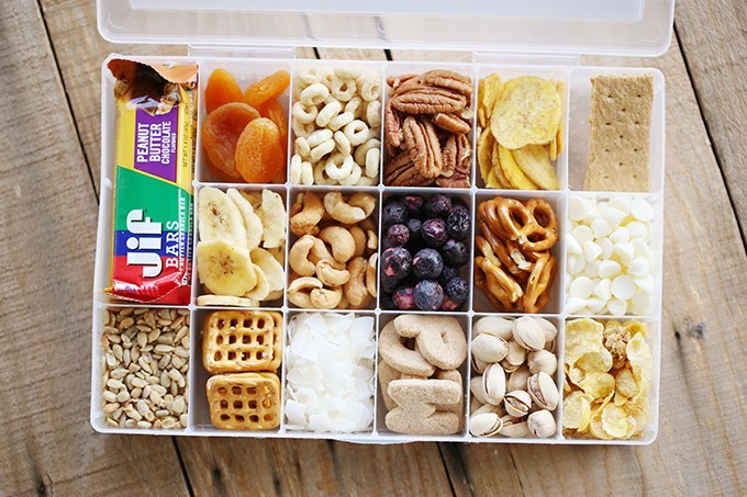 Long journeys make hungry work! While you could always stop at the petrol station mart and grab some munchies there, it’s much better (and healthier!) to pre-pack your car snacks like this photo suggests, and be sure to include healthy options like nuts and cut fruits, as well as lots of water or isotonic drinks to keep you energized throughout your drive.